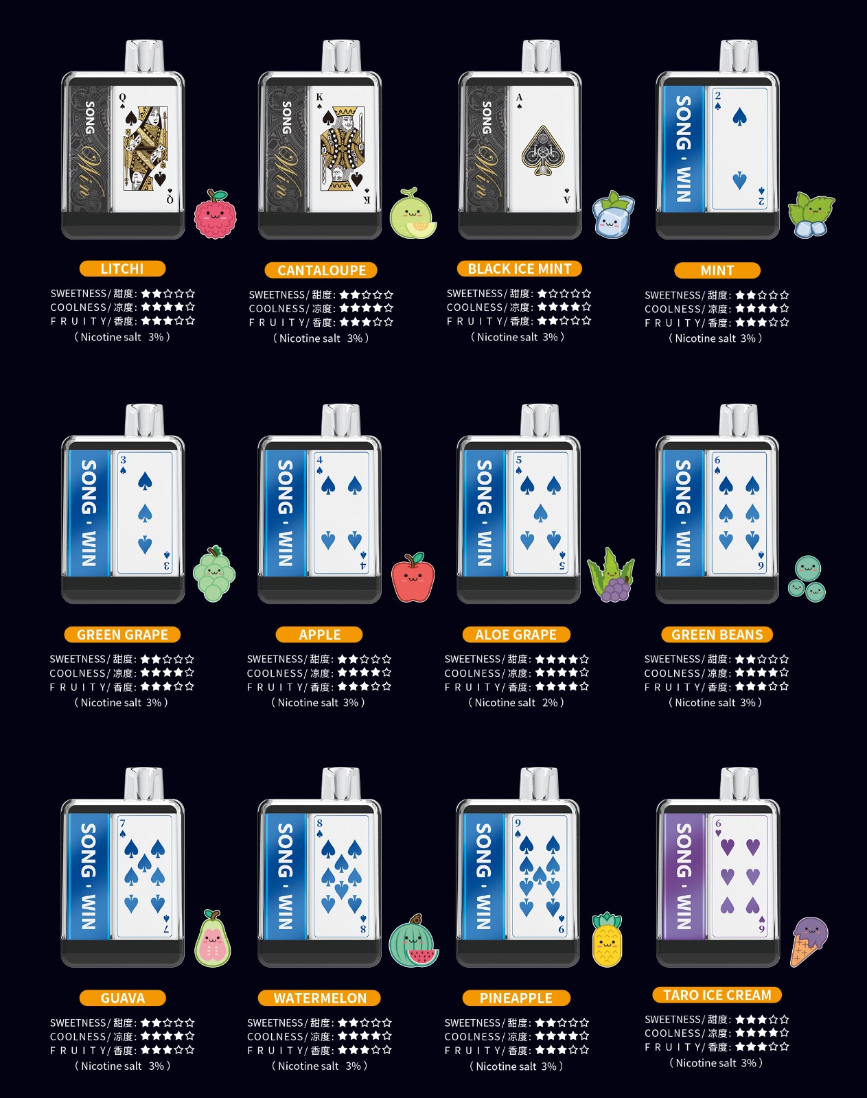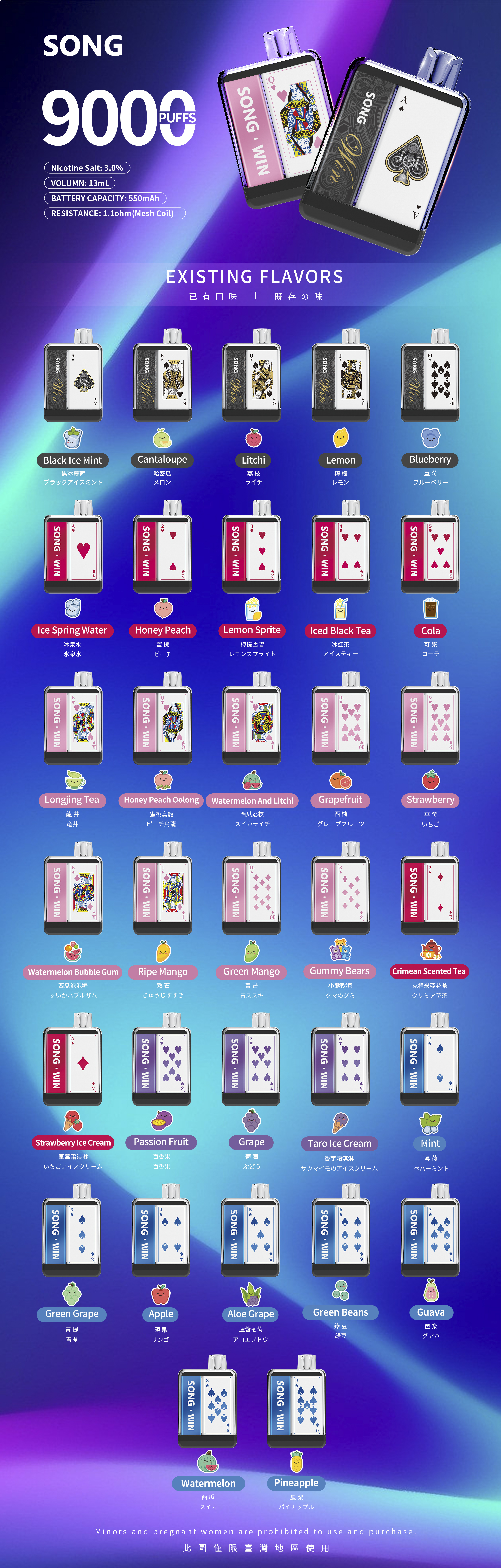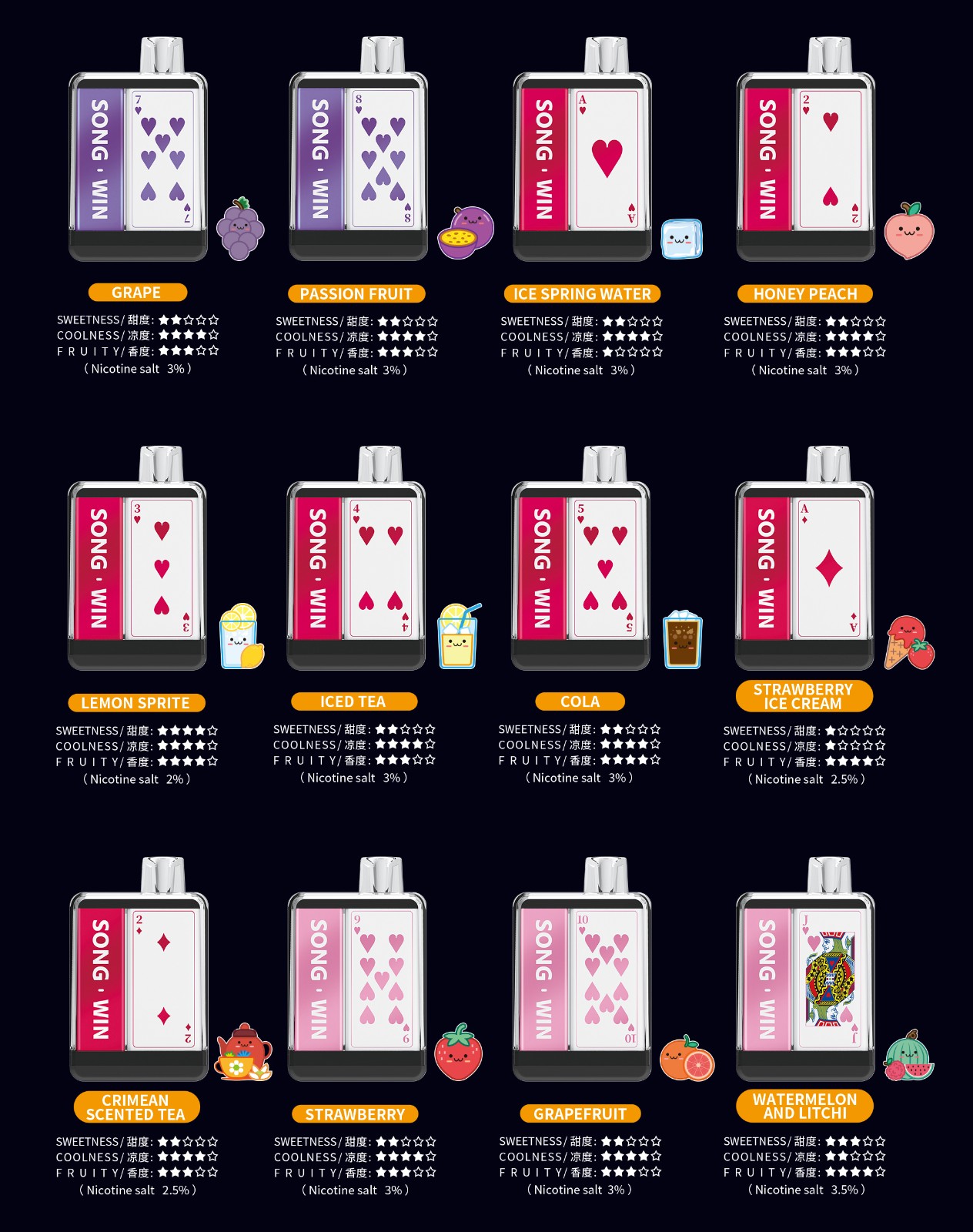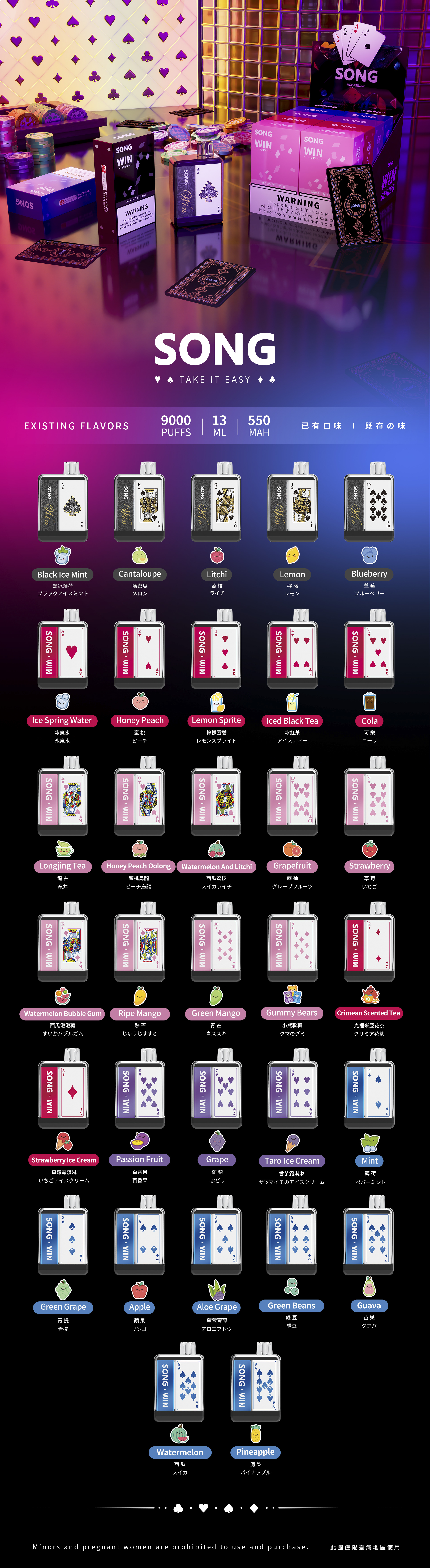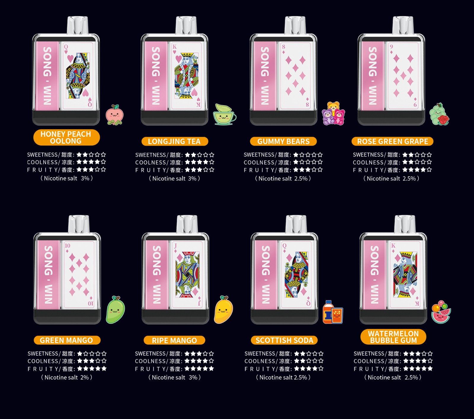 Green Grape、Watermelon、Longjing Tea、Mint、Honey Peach、Taro Ice Cream、Cola......More than 34 flavors