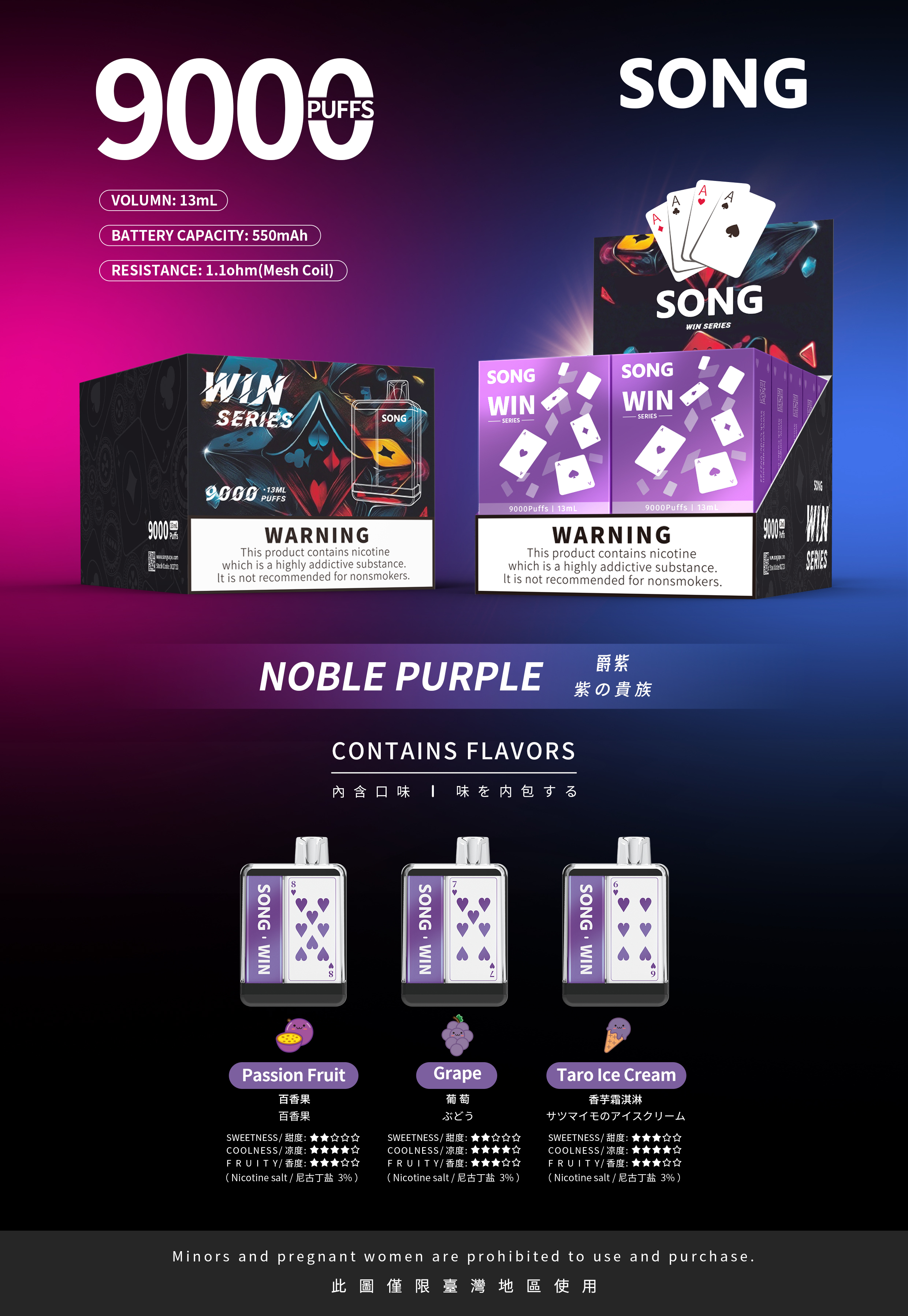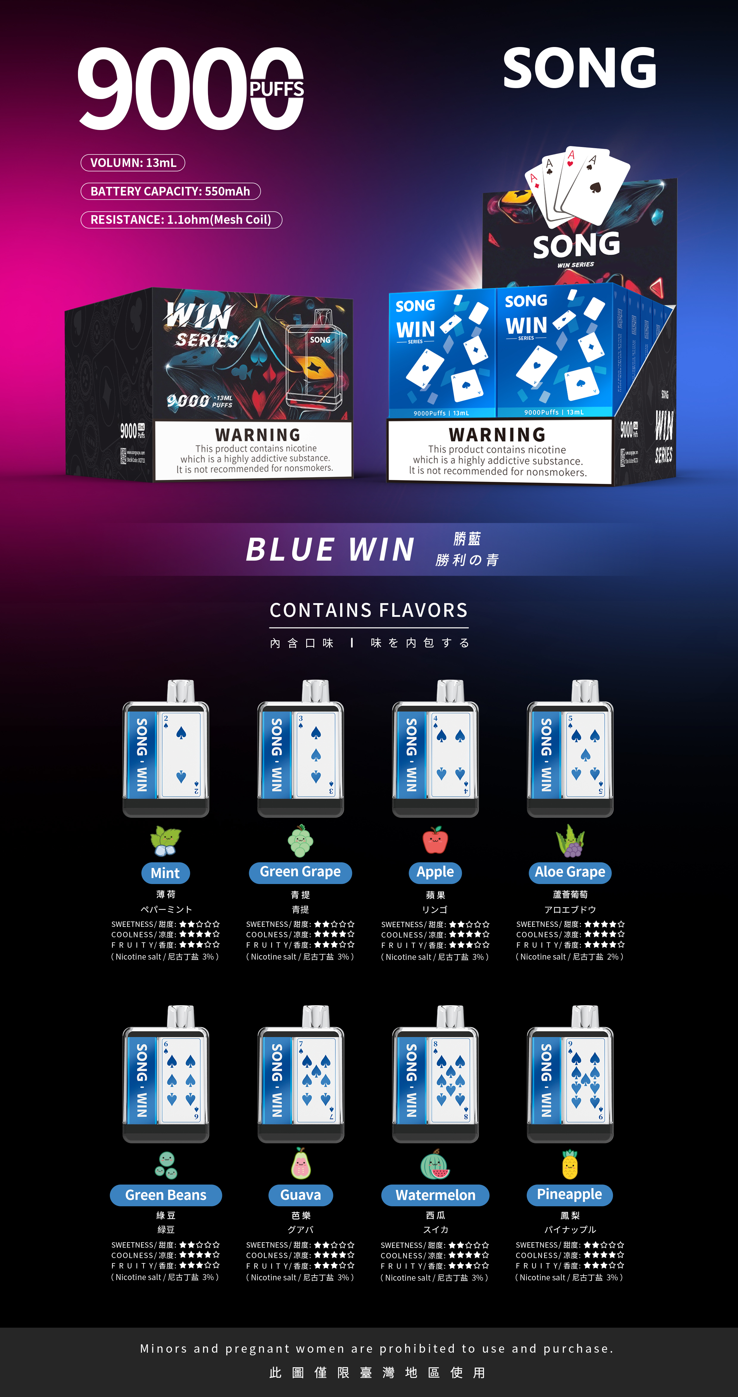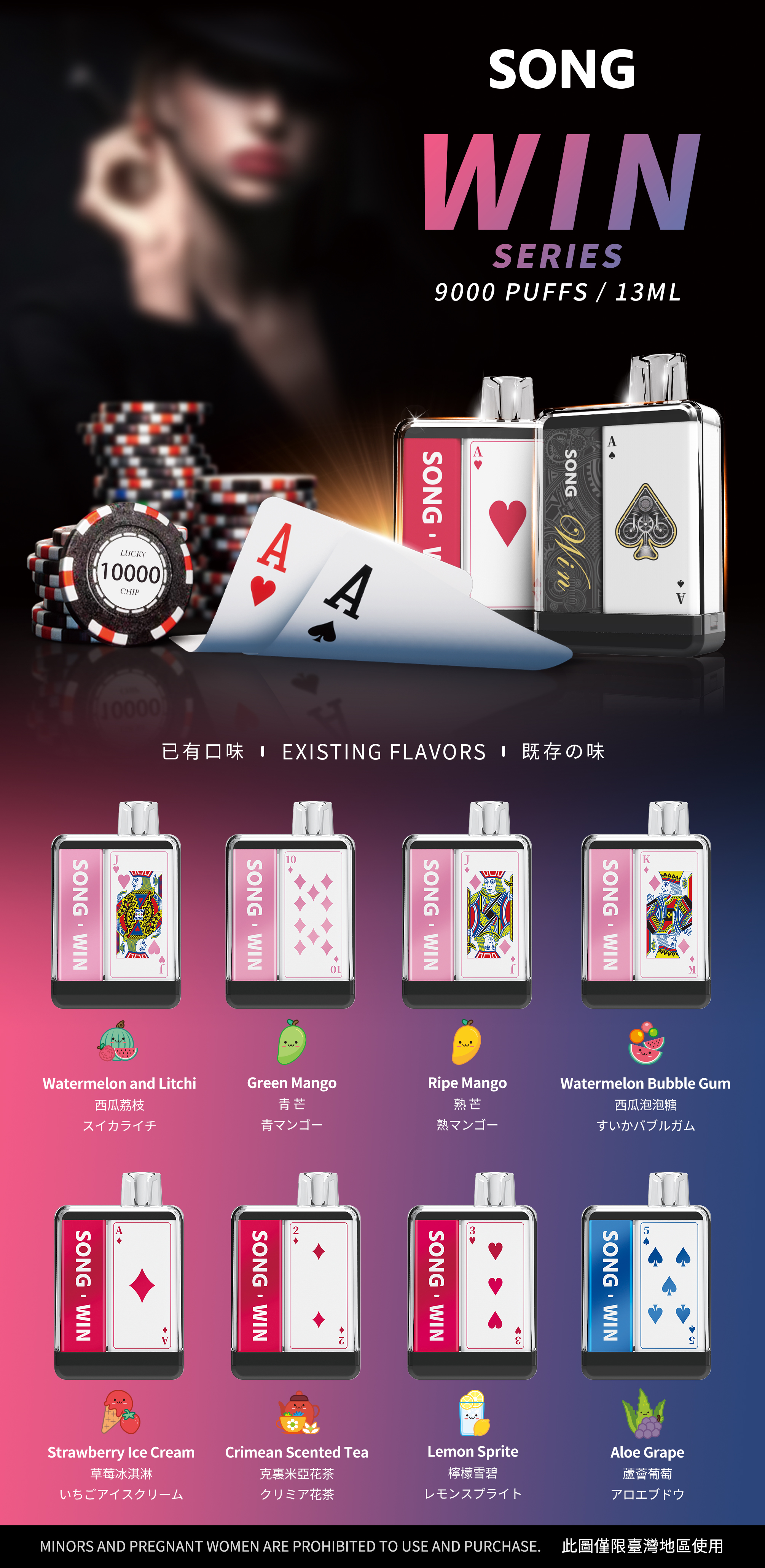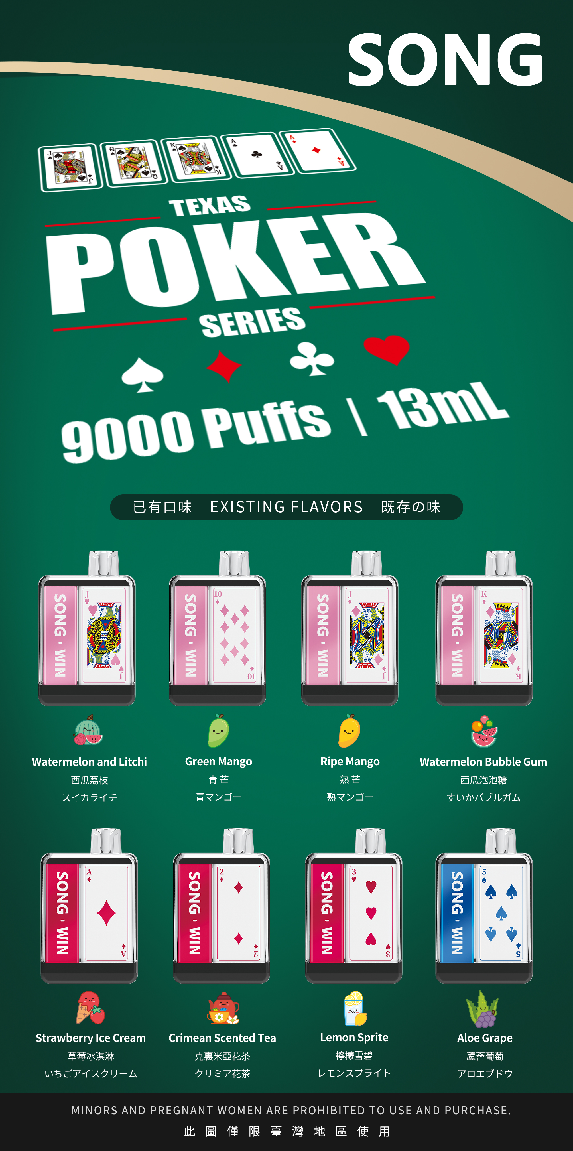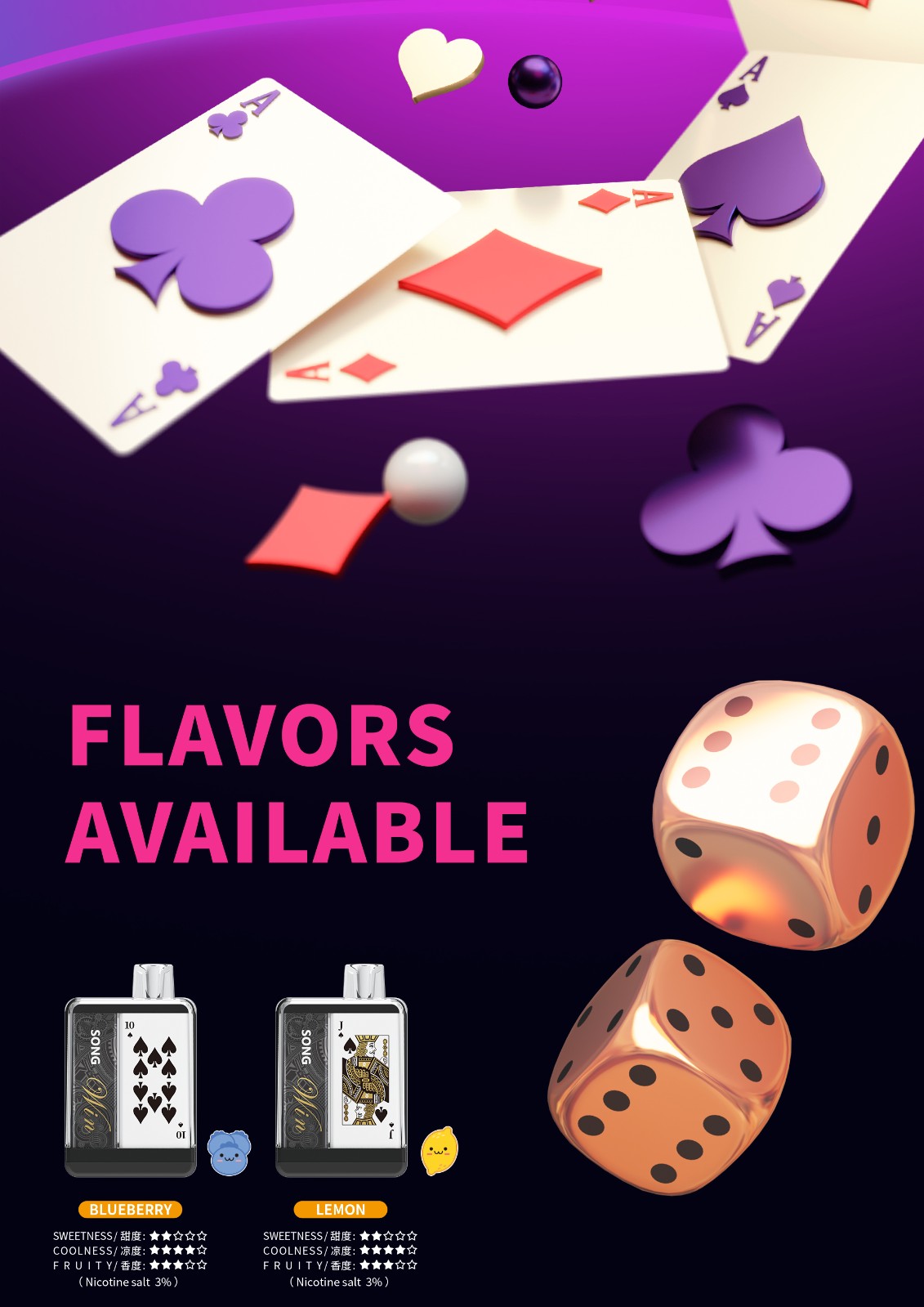 Green Grape、Watermelon、Longjing Tea、Mint、Honey Peach、Taro Ice Cream、Cola......More than 34 flavors