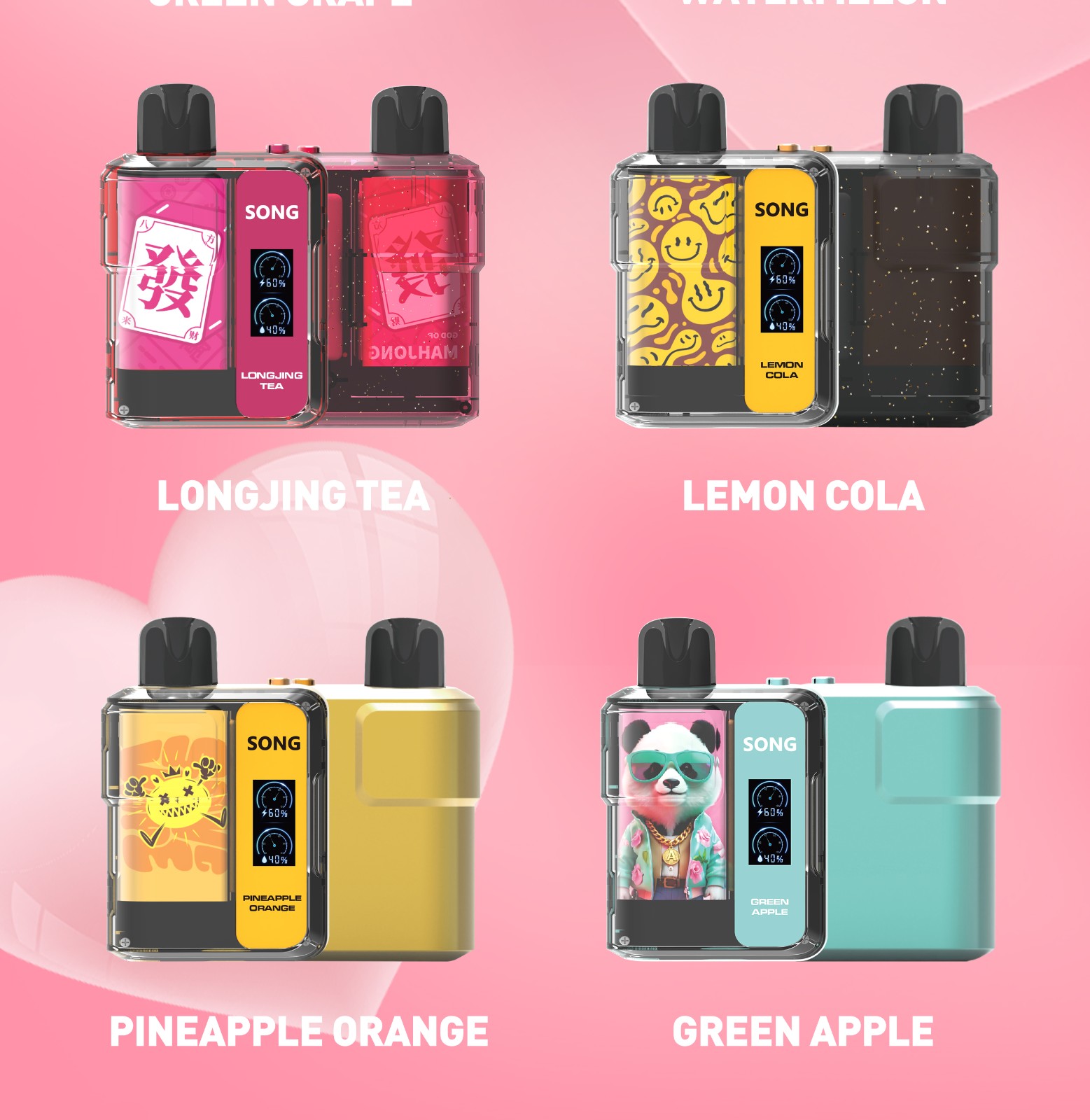 Guava/Litchi/Black Ice Mint/Grape/Cantaloupe/Green Grape/Mint/Longjing Tea/Watermelon/Lemon cola/Pineapple orange/Lime/Passion Fruit Grapefruit/Green Apple/Coconunt Ice