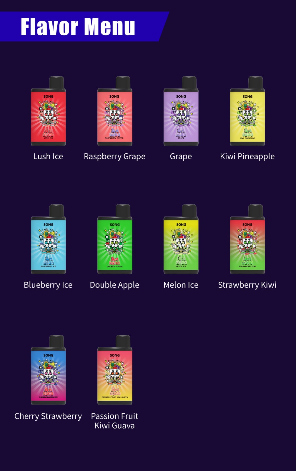 Lush Ice/Raspberry Grape/Grape/Kiwi Pineapple/Blueberry Ice/Double Apple/Melon Ice/Strawberry Kiwi/Cherry Strawberry/Passion Fruit Kiwi Guava
