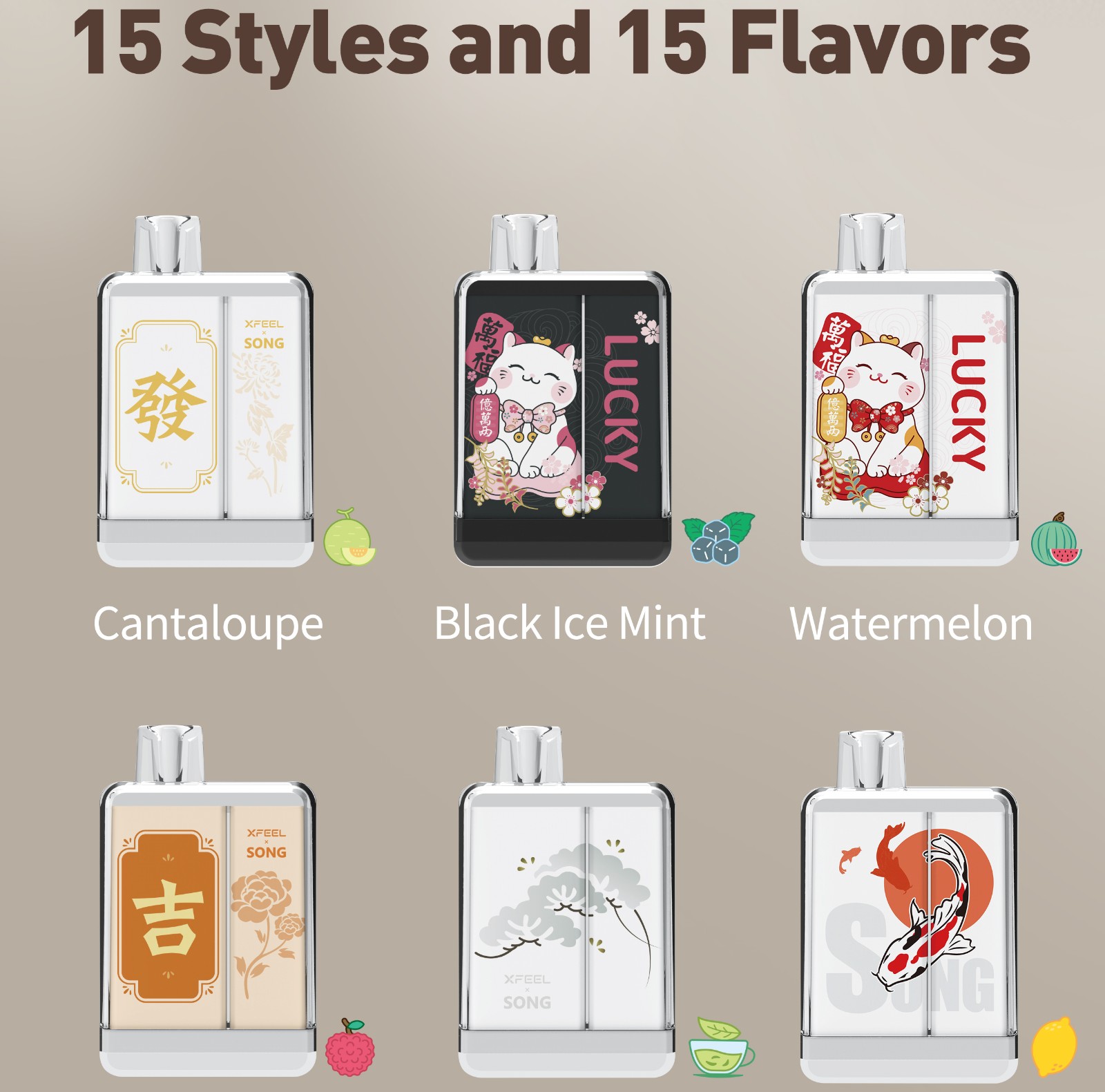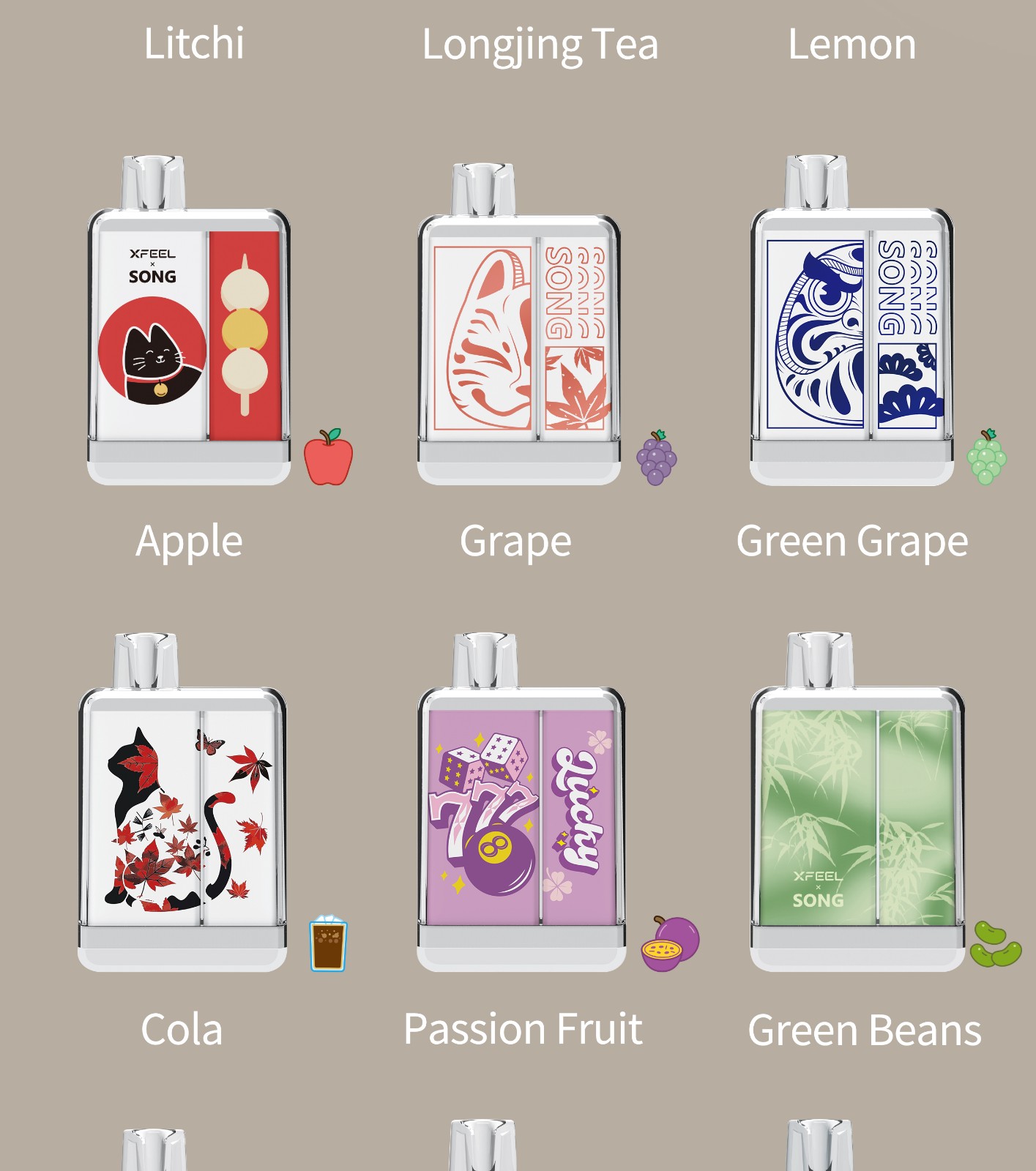 Cantaloupe/Black Ice Mint/Cola/Litchi/Longjing Tea/Lemon/Apple/Grape/Green Grape/Watermelon/Green Beans/Passion Fruit/Honey Peach/Grapefruit/Guava
