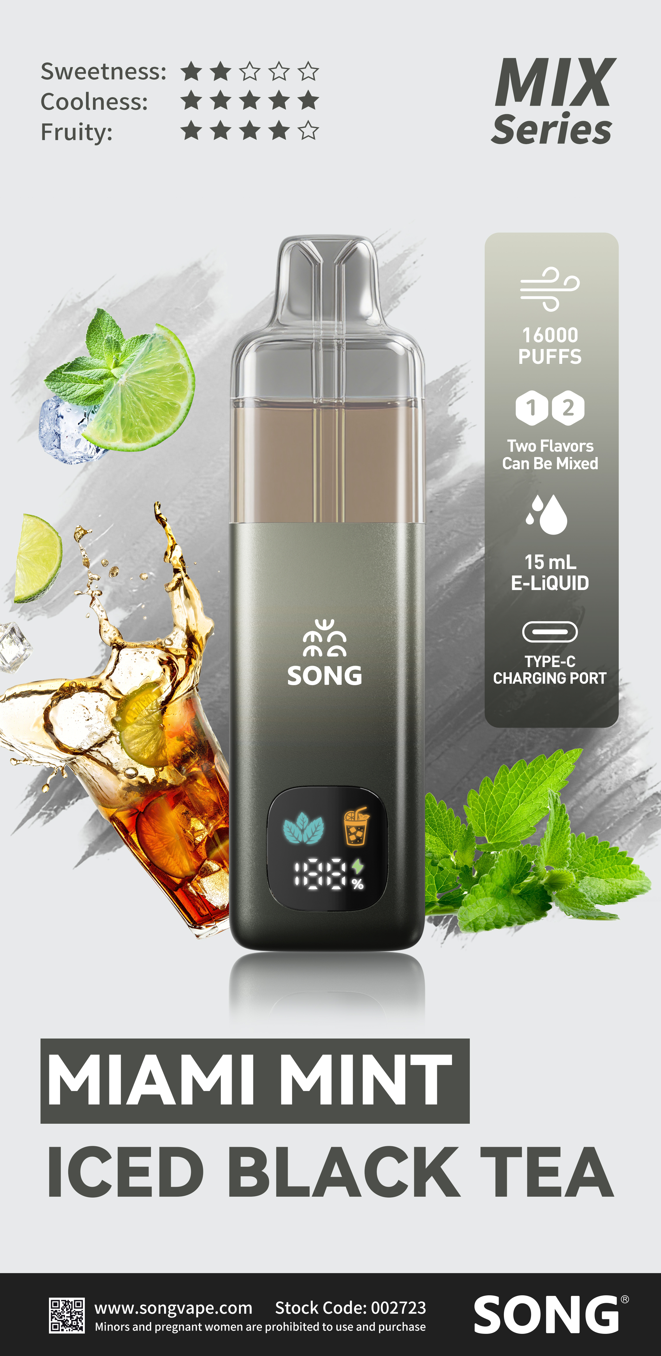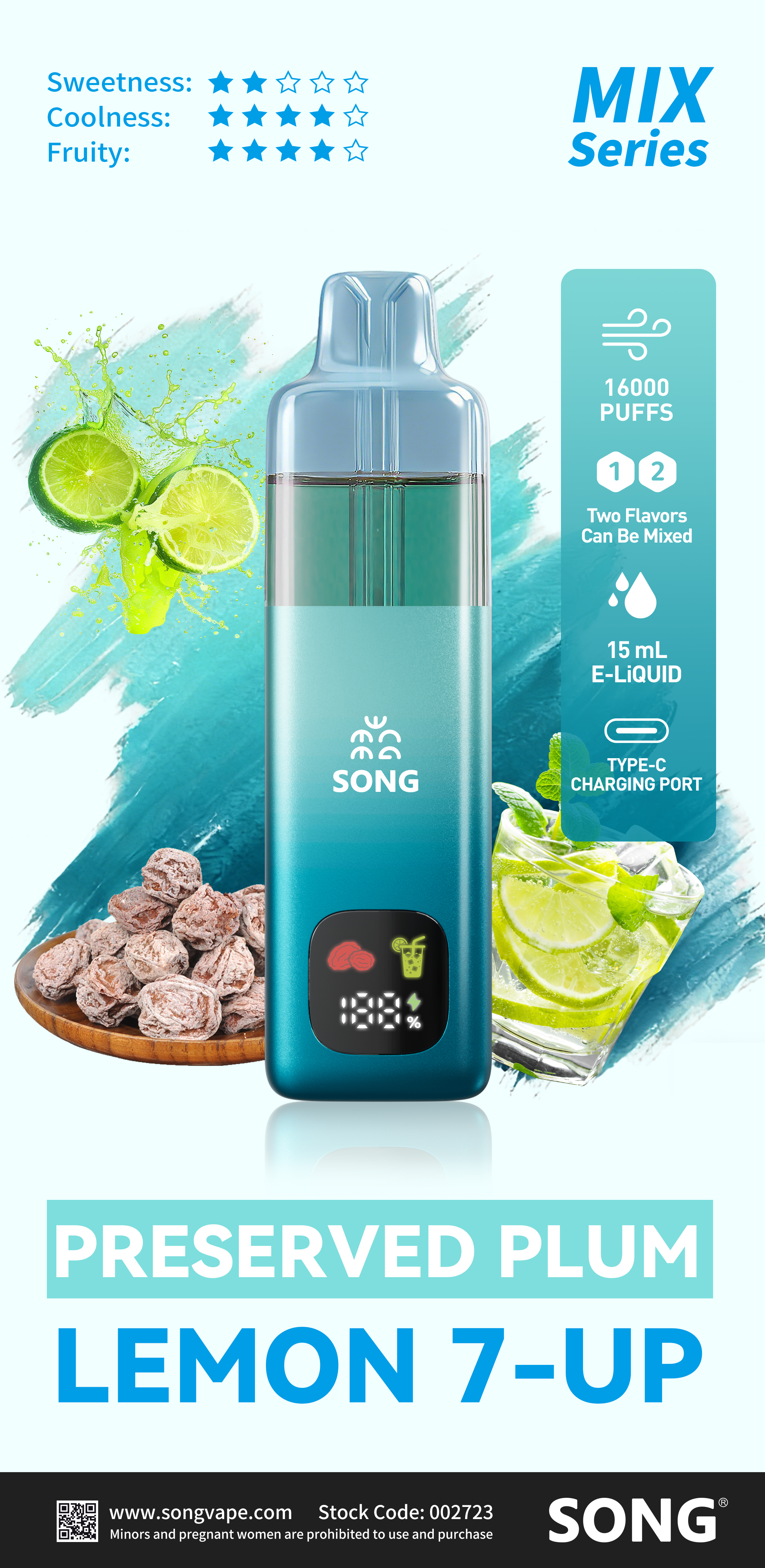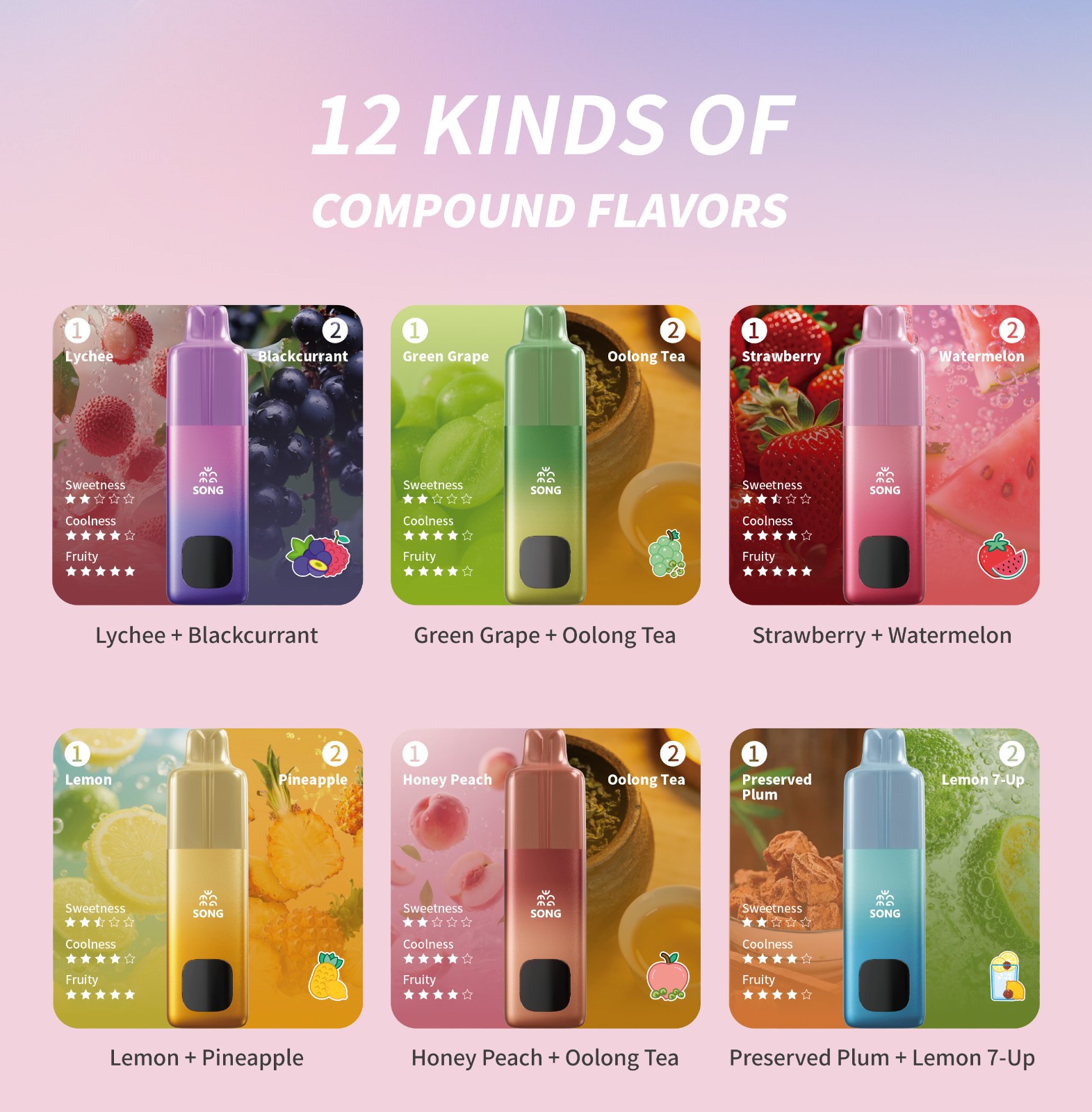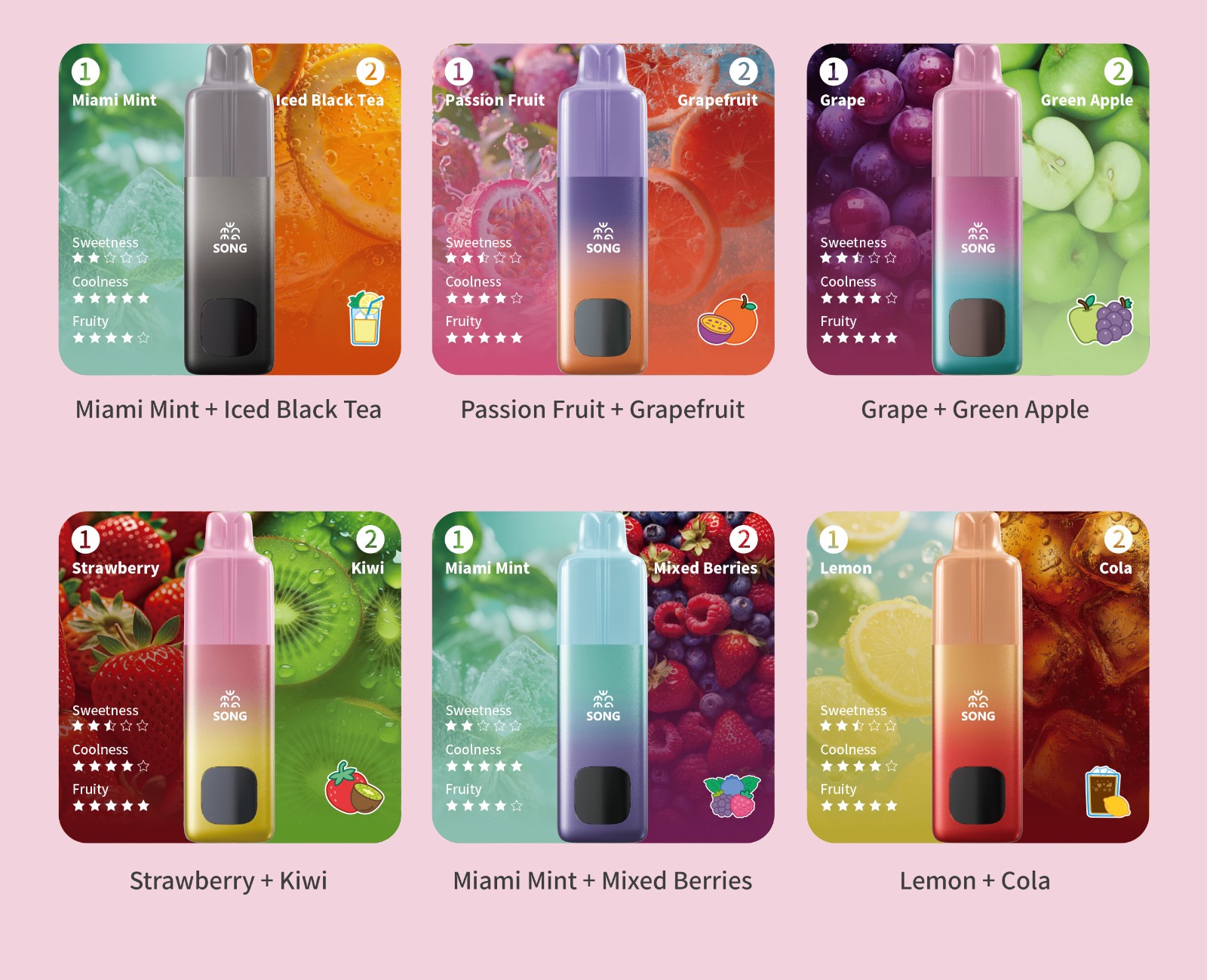 Lychee + Blackcurrant/ Green Grape+Oolong Tea/ Strawberry + Watermelon/ Lemon + Pineapple/ Honey Peach + Oolong Tea/ Preserved Plum + Lemon 7-Up/ Miami Mint +Iced Black Tea/ Passion Fruit + Grapefruit/ Grape +Green Apple/ Strawberry+Kiwi/ Miami Mint + Mix